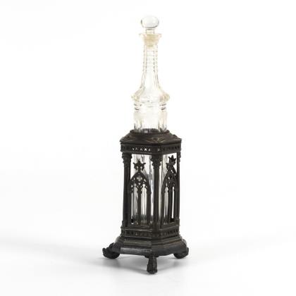 Auf 3 Delphinfüßen turmartiger Fünfeck-Korpus mit gotischem Ecksäulen und Maßwerk in À-Jour-Arbeit sowie Engelsflüchten auf der Schulter. Flacon mit reichem Schliff
