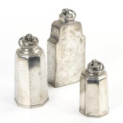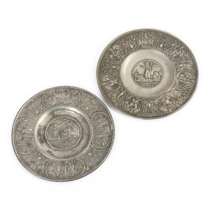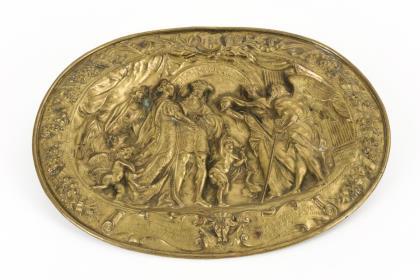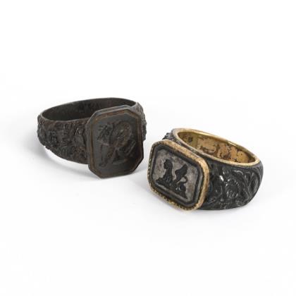 Ringschienen je mit floraler Reliefzier, 1x Innenschiene und Typarrand aus Messing, gravierte Typare (Sphinx bzw. Instrumente)
