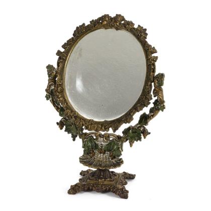 Reich mit Blattwerk verzierter Tischspiegel mit integrierter Muschelschale sowie ovalem Spiegelglas