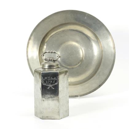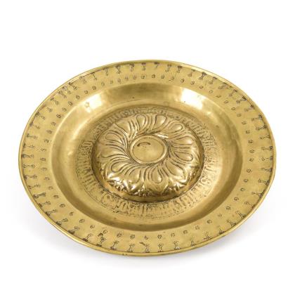 Umboschale mit Fischblasenmotiv und undeutlichem Schriftkranz sowie Punzen auf der Fahne