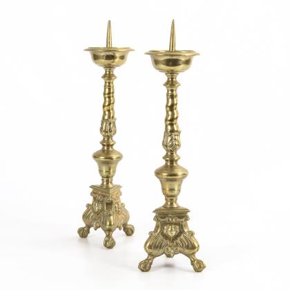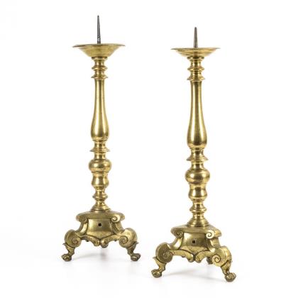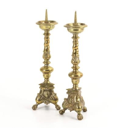 Dreipassiger Sockel mit Klauen-Kugel-Füßen und Engelsköpfen. Über dem Baluster der Blattansatz für den tordierten Schaft sowie Wachsschale mit Bronzedorn