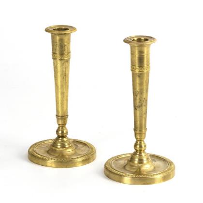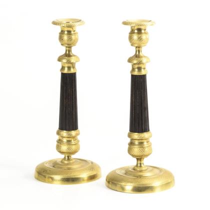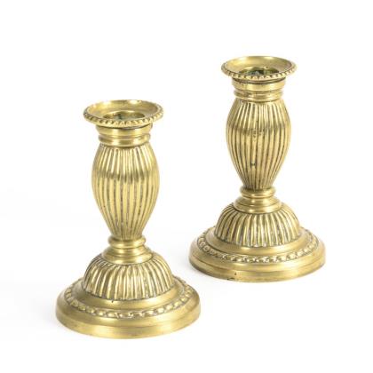 Kleine Bronzeleuchter mit Riffelung am Rundfuß und gedrungenem Schaft