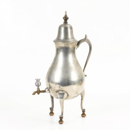 Rundfuß mit stilisierter Reliefzier: Vase und Altar von Voluten gerahmt. Geriffelter Schaft und Vasentülle mit Blattzier