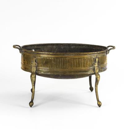 Ovales Blumengefäß mit Messingfüßen, -griffen und geriffelter -wandung sowie ergänztes Sperrholzbrett über dem gewölbten Kupferboden