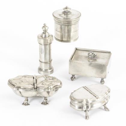 Tumbaförmige Dose mit reichem Reliefornament sowie montiertem Hund auf dem Passdeckel. Reibefläche im Deckel