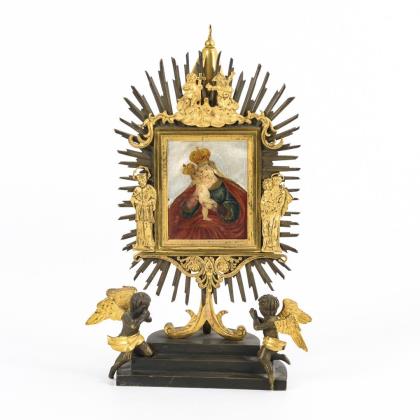 Von Engeln angebetetes Maria-Hilf-Gnadenbild im Strahlenkranz, flankiert von den Heiligen Nepomuk und Josef; bekrönt von der Trinität. Hinten Tragegriff und Klappe für den Brenner