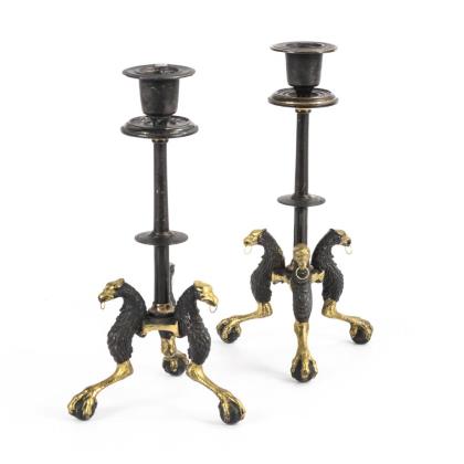 Paar spiegelbildlich gearbeitete Bronzeleuchter mit Luzifer. Schlanker Leuchter mit 3 vollplastischen Löwen als Füße und 3 Ziegenköpfen an der Tülle<br /><strong>Nachtrag 08.06.21: 2 x 13 cm ; 1 x 23 cm</strong>