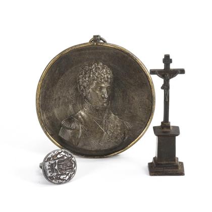 Bildnisplakette, zierliches Kruzifix und Petschaft Eisenguss