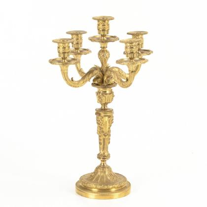 Kerzenleuchter im Louis-Seize-Stil mit reicher Reliefzier, darunter Löwenköpfe mit Girlanden am Schaft. 4 blattbesetzte Volutenarme mit Vasentüllen sowie erhöhte Zentraltülle