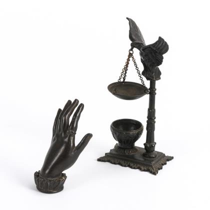 2x Eisenguss: Räucherlampe mit Adler und Briefbeschwerer als Damenhand