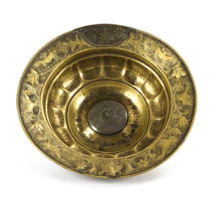 Frei getriebene Schüssel mit godronierter Wandung; auf der Fahne Vögel und Tiere auf Blumenzweigen sowie leere Kartusche