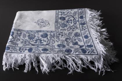 Großes Tuch mit breitem Randdekor "Zwiebelmuster" und Fransenkante. Gesticktes Monogramm SD