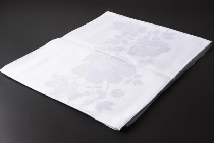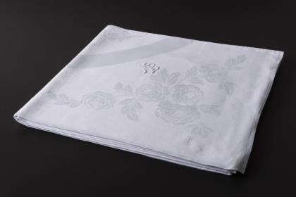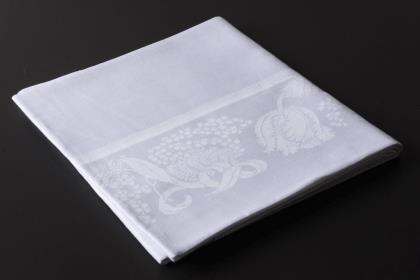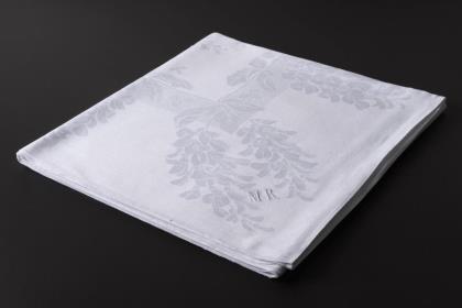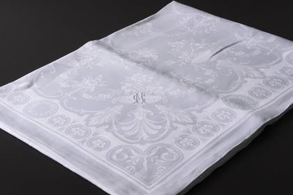 Zartes Blütenrispendekor im Mittelteil und breiter Rand. Gesticktes Monogramm MR