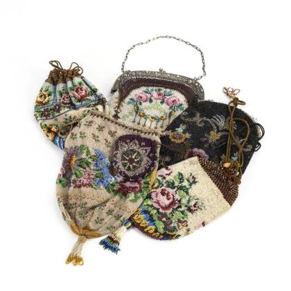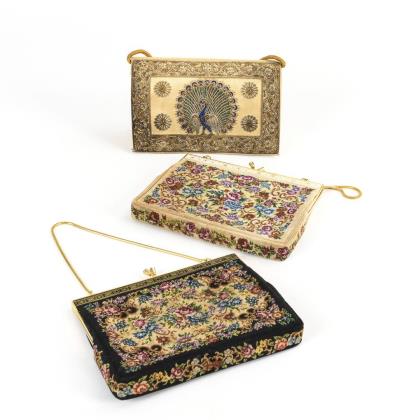 Tasche mit schauseitig aufwendigen Lahn- und Cannetillestickereien (wohl persisch) mit Druckknopfverschluss und Bandhenkel. 2 Taschen mit allseitiger Gobelinstickerei, Metallbügel, Kugeldrücker und Schlangenkettenhenkeln