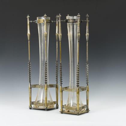 Längsoptisch geblasene Stangenvasen in Haltestreben mit Kugel- und Rillenzier