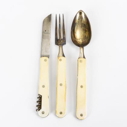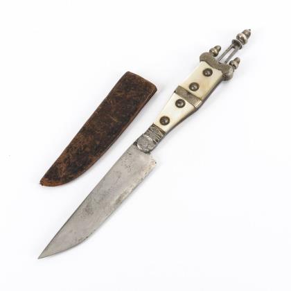 Messer mit Perlmutt-Griffschalen und Eichelknäufen sowie integriertem Gabelpfriem; evtl. von einem "Fuhrmannsbesteck"