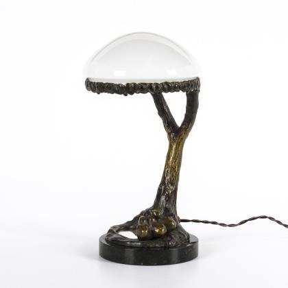 Jugendstil-Tischlampe mit Bronzefuß: Küken am See