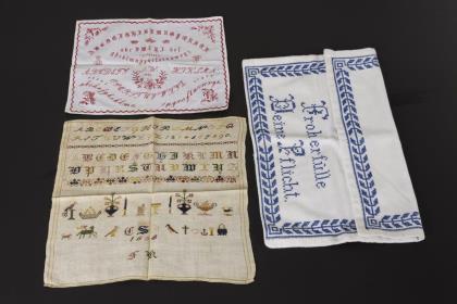 ABC-Stickmustertuch mit volkstümlichen Motiven, datiert 1838, Monogrammen CSI und FK. ABC-Stickmustertuch mit floralen Dekoren und Kronen, datiert 1882, Monogramme EI, AW, VS. Aus Arbeitsstoff genähte Tasche mit ABC-Stickerei, Randdekoren und Sprüchen , datiert 1914, signiert K. Veit
