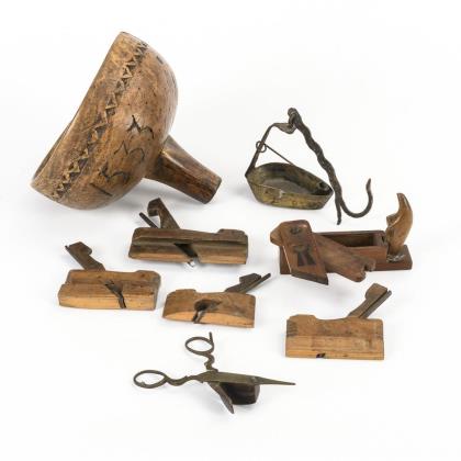 Holztrichter "RS 1533". / Offener Frosch mit Messing-Topf. / Dose in Hobelform wohl aus Zwetschge. / 4 Sims- bzw. Falzhobel. / Lichtputzschere