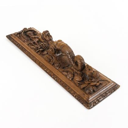 Grundbretter in barocker Zier, 1 Rehkopf mit Knoblauch im Äser als Symbol der Heilkraft