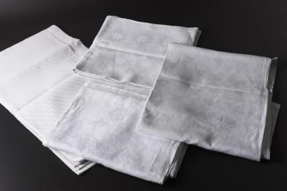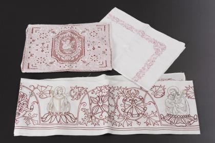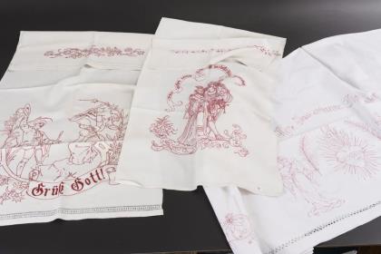 Altartuch mit rotweißem Herzjesu-Motiv, 2 Überhandtücher mit Motiven aus dem Hause Wittelsbach mit Stickereien