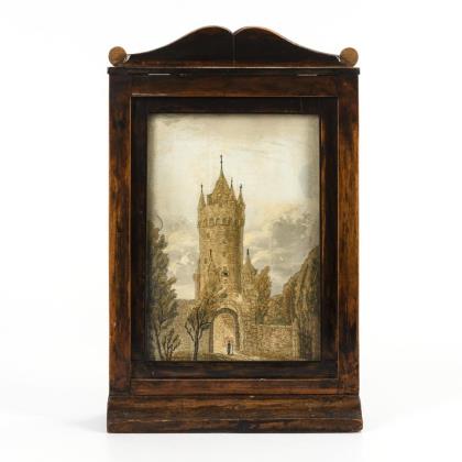 Eichen-Fußleiste, Rahmen mit geschweifter Bekrönung. Gesticktes Stadttor mit Staffage und gemaltem Himmel