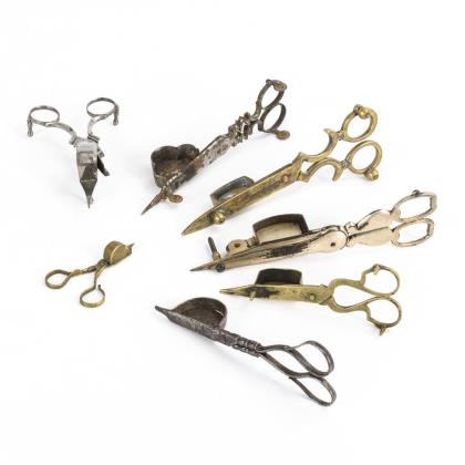 Lichtputzscheren verschiedener Größe. Die große verchromte steht auf Rädern, die vernickelte hat Zusatzfunktionen