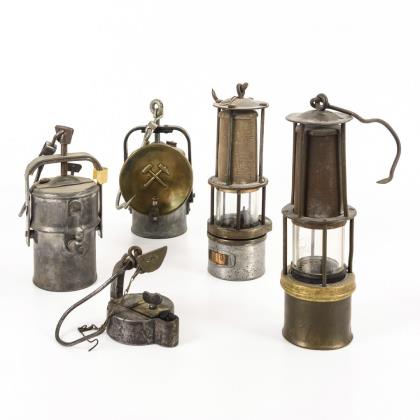 Westfälischer Frosch mit Messing-Scharnierdeckel und -Spiegel; darauf "Glück auf" mit Bergmannssymbol. Wohl Firma Wilhelm Seippel Bochum. / 2 Karbid-Lampen bzw. 2 Wetterlampen, diese je mit Nr