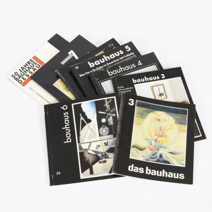 "Das Haus Dr. Rabe in Zwenkau bei Leipzig"; "Franz Ehrlich die frühen Jahre"; "Arbeiten der Jahre 1919 - 33"; "Neuerwerbungen seit 1984"; Bauhaus Fotografie; und zwei weitere Kataloge mit gemischten Themen. / Zeitschrift "form+zweck" 6/1976, "50 Jahre Bauhaus Dessau"