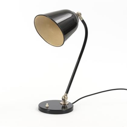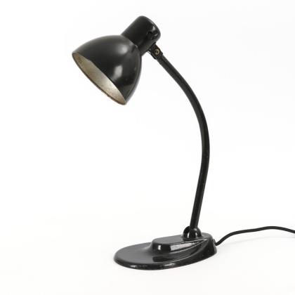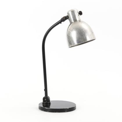 Moderne Schreibtischlampe mit Gelenkarm und beweglichem Lampenschirm im Bauhaus-Design. Sogenanntes "Modell der 4. Generation", dessen Bewegungsbereich und Standfestigkeit durch Anpassung des Fußes, des Fußgelenkes und des Tragarmes enorm vergrößert werden konnte