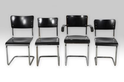 4 "hinterbeinlose Kragstühle" und Bauhaus-Design-Klassiker: 3 Freischwinger "S 32", H 75 bis 80 cm, Sitzhöhe ca. 43 bis 44 cm | 1 Armlehn-Freischwinger "S 64", H 82 cm, Sitzhöhe ca. 46 cm