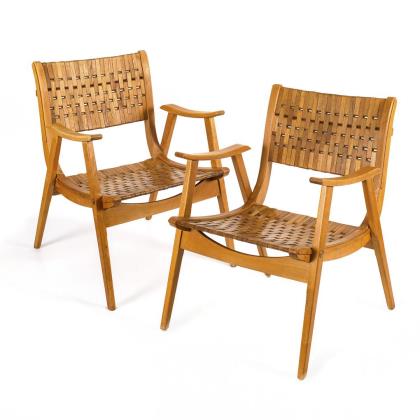 2 Bauhaus-Designklassiker mit beweglicher und durch Spiralfedern verbundener Sitzfläche und Rückenlehne aus Rechteckhölzchen, die sich an den Körper anpassen <strong>| Nachtrag 19.6.21: Der Entwurf stammt NICHT von Erich Dieckmann! Das Patent für "Gelenka" (Feder-Klötzchen-System) erhielt Ernst Breitenborn. Die Herstellung erfolgte zwischen 1953 und 1958 in Wolfhagen in Hessen. Literatur: Holz-Zentralblatt: "Die Gelenka-Story", 2019</strong>