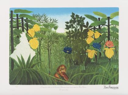 Bezeichnet "Lithographie réaliseé par les Imprimeries Parisiennes, d'après l'œuvre originale de Henri Rousseau "Les repas du lion"
