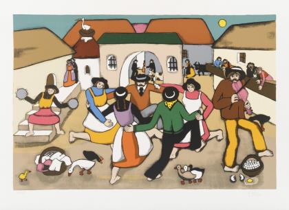 "Dorffest", Blatt: 63,3 x 86 cm, Exemplar: 272/325 | "Die Hochzeit", Blatt: 90 x 66 cm, Exemplar: 169/325, oberer Rand mit Knick, rechter Rand mit kleinem Farbfleck | "Musizierende Familie", Blatt: 92,6 x 65,7 cm, Exemplar: 176/325, Ecke oben rechts mit Knick | "Wintervergnügen", Blatt: 81 x 65,5 cm, Exemplar: 231/325 | "Weihnachten in den Bergen", Blatt: 65,7 x 81,5 cm, Exemplar: 193/325