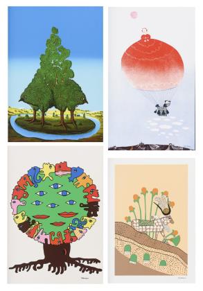Hahn: Vogelbaum, Blatt: 58,5 x 41,5 cm | Pedro Uhart: "Arbre De Vie", Blatt: 57,7 x 41 cm | Christine Thoeyeau: Ballonfahrt, Blatt: 58,3 x 36 cm | Kramer: Bergziege, Blatt: 58 x 41 cm