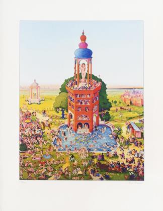 Straßenmusikant, Farbsiebdruck auf Bütten, Blatt: 49 x 42 cm | Ballonfahrt, Farbsiebdruck auf Bütten, Blatt: 54,3 x 42 cm, Exemplar: 140/175 | Straßenfest, Farbradierung auf Arches-Bütten, Blatt: 66,5 x 50,5 cm, Exemplar: 28/150 | Straßenszene, Farbradierung in Blau auf Arches-Bütten, Blatt: 65,7 x 50 cm, Exemplar: 27/150, Ecke oben links mit Knick | Straßenszene, Farbsiebdruck auf BFK-Rives-Bütten, Blatt: 75,7 x 56 cm