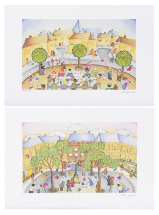 Ansicht eines belebten Dorfes, Exemplar: 44/200, im oberen Randbereich etwas griffspurig | Zwei Damen beim Kartenspiel, Exemplar: 44/200, kleiner Farbfleck unten rechts | Stadtansicht mit Kanal und Brücke, Exemplar: 44/200