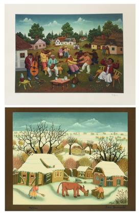 Ansicht eines Dorfes im Winter, Blatt: 50 x 65 cm, Stiftsignatur, Exemplar: 14/200, [1972], rechter Rand mit kleinen Rissen | Dorffest, Platte: 43,5 x 60 cm, Blatt: 59 x 75 cm, Bleistiftsignatur, Exemplar: 137/260, minimal griff- und knickspurig