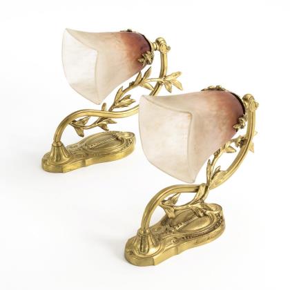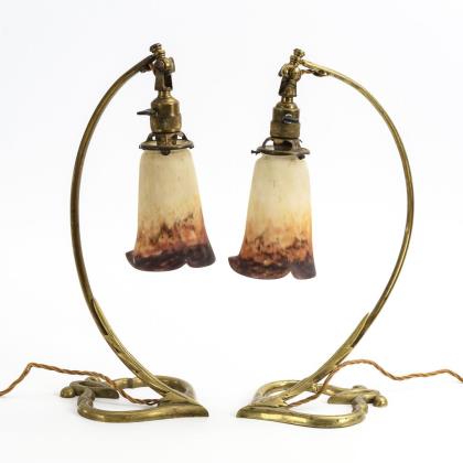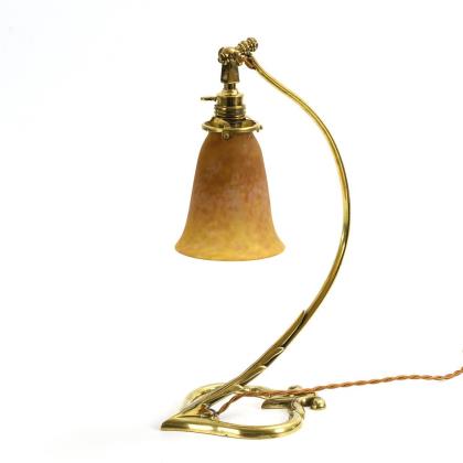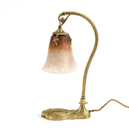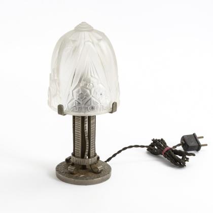 Halbovoider Schirm mit stilisiertem Blumenrelief (H 14,5 cm). Auf vierstrebigem Schaft mit gerollten Füßen, Rundfuß. Elektrifiziert (Funktion nicht geprüft)