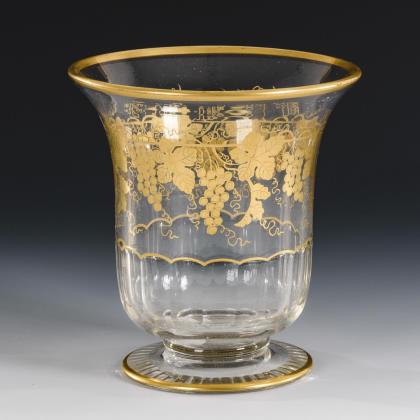 Halbovoide, am Ansatz facettiere Kuppa, Stängelschaft, Rundfuß. Auf der Kuppa goldenes Liniendekor mit drei stilisierten Blumenkränzen