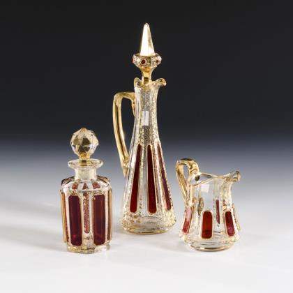 Facettierte Gläser mit hochgeschliffenen Rechteckfeldern und goldenem Wurmliniendekor. Karaffe (H 22,5 cm), Flakon (H 12,5 cm) und Milchkännchen (H 8 cm)