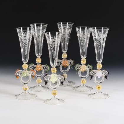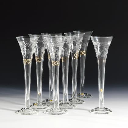 Sektflöten mit Steinelschliffband, gravierten Blüten sowie einem goldgemalten Monogramm