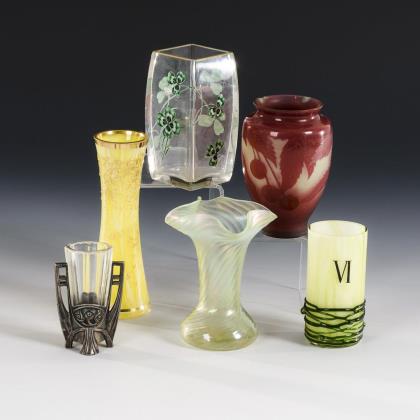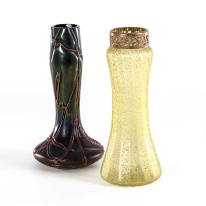 1x aus dunkelviolettem, irisiertem Glas mit purpurfarbenen, netzartig aufgeschmolzenen Fäden: Vase mit gedrückt gebauchtem Stand und Enghals. / 1x längsoptisch geblasene, konkave Vase aus farblosem, irisiertem Glas mit aufgewalzten grünen Glasperlen und Metallmontierung am Mündungsrand