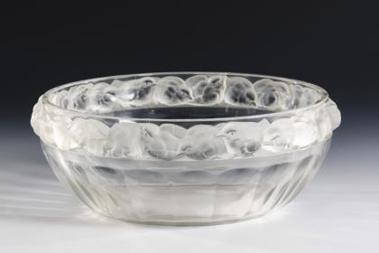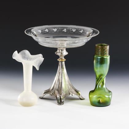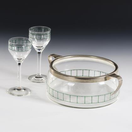 Schale mit metallmontiertem Rand und zwei Henkeln, 2 Stängelgläser. Mit einem geschliffenen, mit grünem Transparentemail konturierten Würfelband