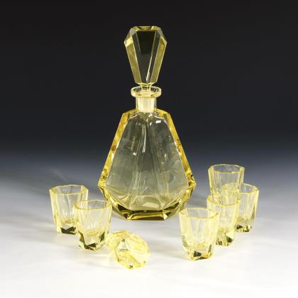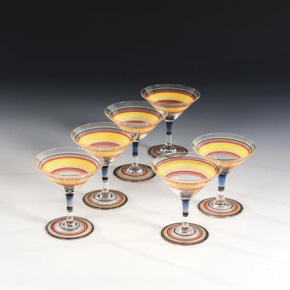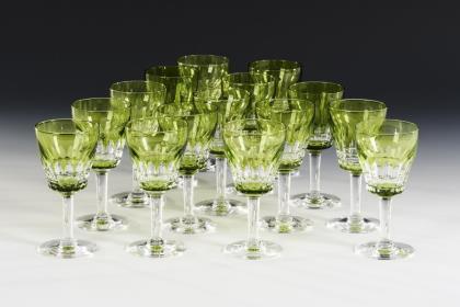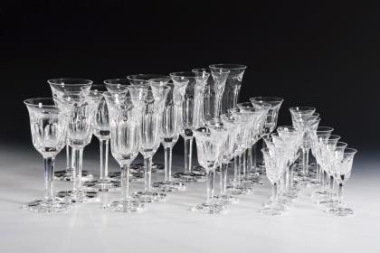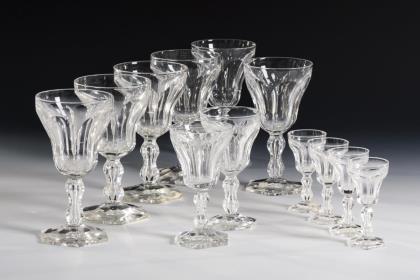 30 Teile. Teils facettierte Glockenkuppa, facettierter Stängel, sechseckiger Fuß. 6 Sektgäser (H 20,5 cm), 6 Weingläser (H 19 cm), 6 Südweingläser (H 14,5 cm), 6 Likörgläser (H 12 cm) und 6 Schnapsgläser (H 11 cm)