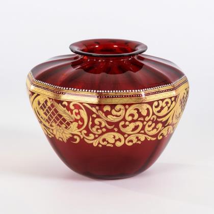 Längsoptisch geblasene, gedrungene Balustervase, Abriss. An der Schulter ein goldgemaltes Akanthusblattband mit Grillagen, darüber weiße Emailpünktchen