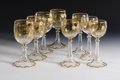 4 Rotwein- und 4 Weißweingläser. Bauchige Kuppa, Trompetenschaft mit zehnfach gekniffenem Rundfuß. Auf der Kuppa Floralmalerei in Gold und Silber