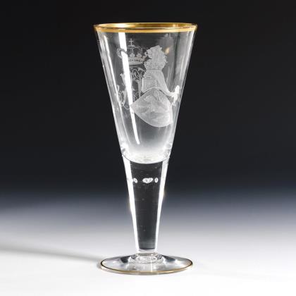 Konische, in den massiven Schaft mit eingeschmolzenem Luftblasenkranz übergehende Kuppa, Rundfuß, ausgekugelter Abriss. Auf der Kuppa das gravierte Wappen der Adelsfamilie von Schönberg, verso das bekrönte Monogramm "IR", auf der Auskugelung die Bezeichnung "Ltnt. von Schönberg 1899"