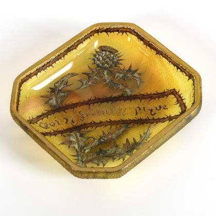 Rechteckige Schale mit angeschnittenen Ecken. Im Spiegel die emailgemalte Darstellung einer Distelpflanze sowie zwischen Dornen der Spruch "Qui s'y frotte, s'y pique"