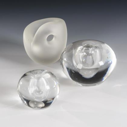 2 kugelige Vasen (H 5,5 und 7 cm). / 1 Vase mit geschwungenem Mündungsrand und Wandungsdurchbruch (H 9,5 cm)